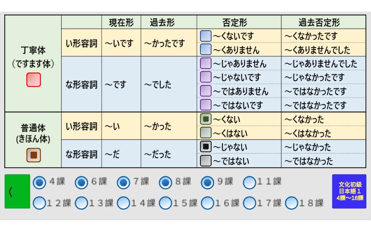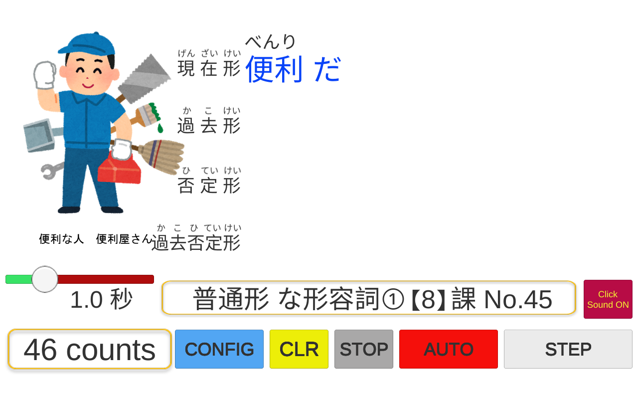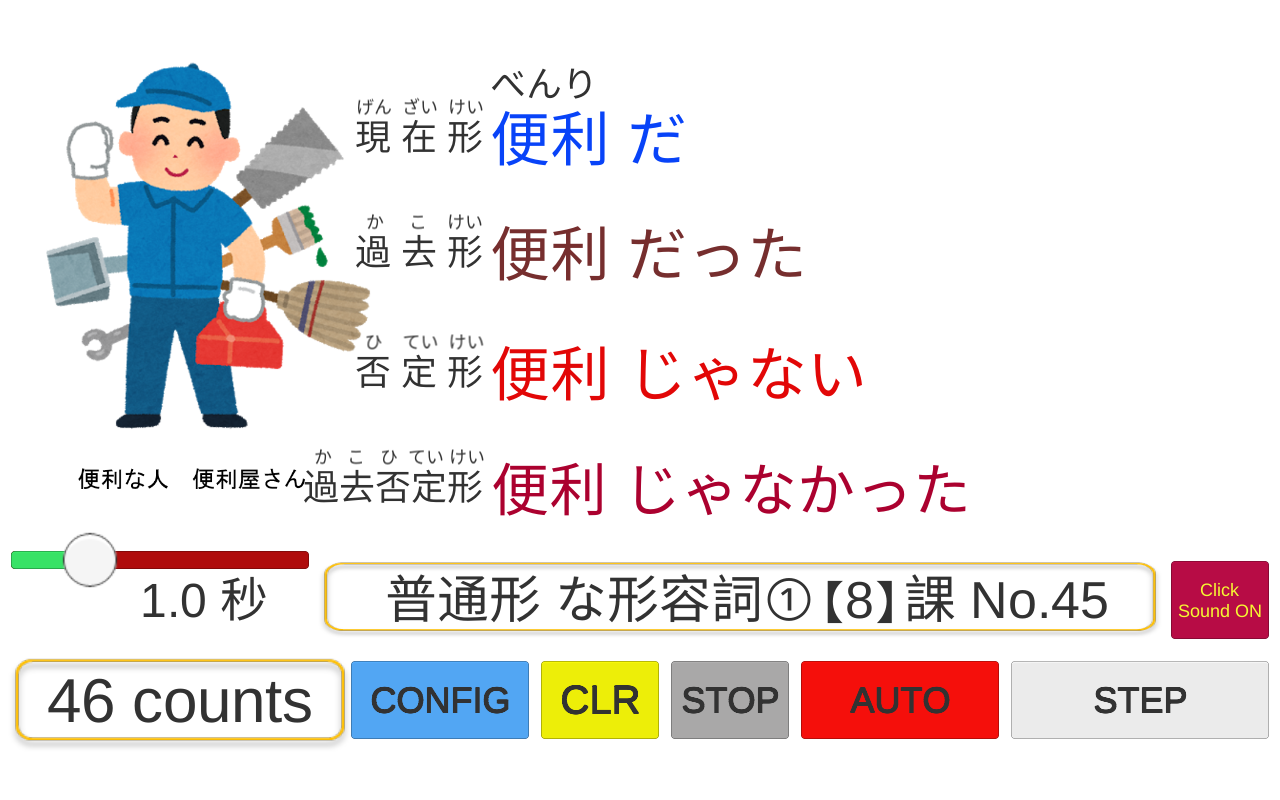 ※下記のアプリは参考としているテキスト(「文化初級日本語1」or「みんなの日本語初級1」)毎になっていること、及び 表示を1行ずつ進める「STEP]ボタンがありません。